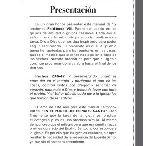 Es un gran honor presentar este manual de 52 lecciones Faithbook VIII. Podrá ser usado en los grupos de amistad o grupos celulares. Cada año el señor nos da la sabiduría para poder realizar esta tarea. Oro a Dios que nos siga inspirando para poder