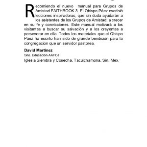 Este manual motivará a los visitantes a buscar su salvación y a los creyentes a perseverar en ella. Todos los materiales que el Obispo Páez ha escrito han sido de grande bendición para la congregación que un servidor pastorea.